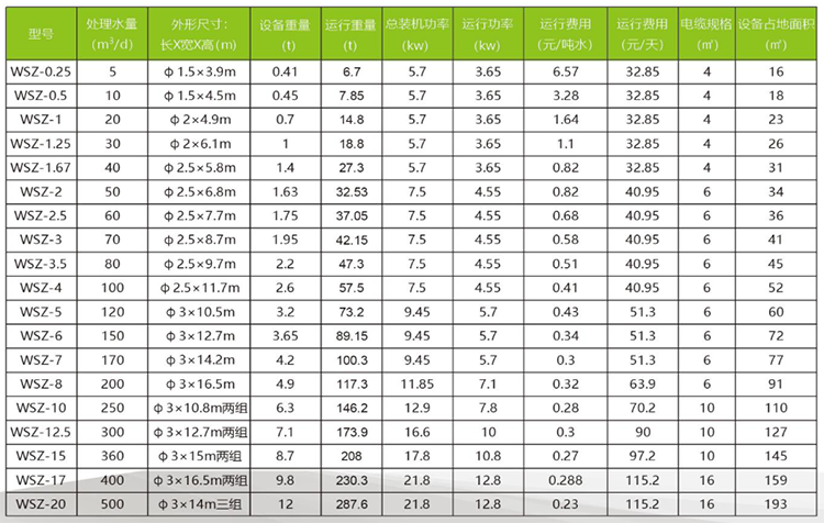 根據下面的表格和給出的參數 我們應該選擇WSZ-1型號的QDPP一體化污水處理設備最為合適,這這個表格中我們可以詳細的看到選型設備的各種參數,我們可以看到一體化污水處理設備的外形尺寸師直徑為2米,長度為4.9米的設備,占地面積為23平米, 根據這個尺寸我們可以確定 項目現場占地面積和需要多大的地方就可以安裝這個設備,后面的數據有重量,根據這個稱重量來做地基的土建建設,還有運行功率和后期的運行費用都可以一目了然。